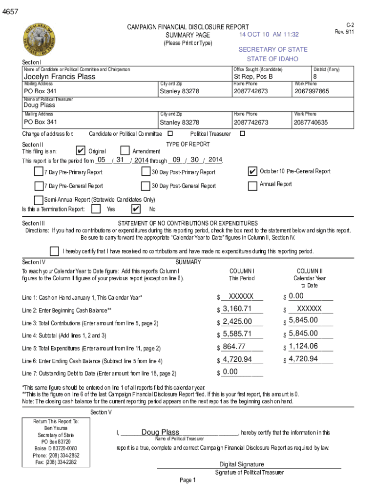 4657 C2 Rev. 5/11CAMPAIGN FINANCIAL DISCLOSURE REPORT 14 OCT 10 AM 11:32 SUMMARY PAGE (Please Print or Type) SECRETARY OF STATE OF IDAHOSection I Name of Candidate or Political Committee and ChairpersonOffice