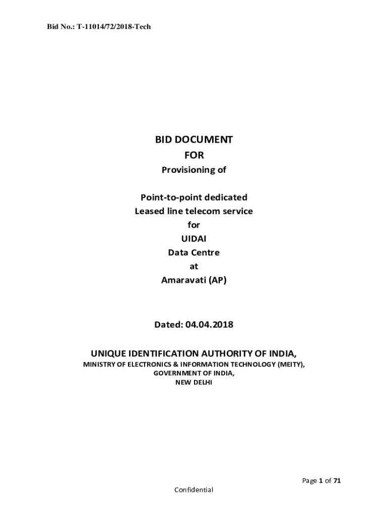 Bid No.: T11014/72/2018TechBID DOCUMENT FOR Provisioning of Pointtopoint dedicated Leased line telecom service for UI DAI Data Center at Amaravati (AP)Dated: 04.04.2018 UNIQUE IDENTIFICATION AUTHORITY