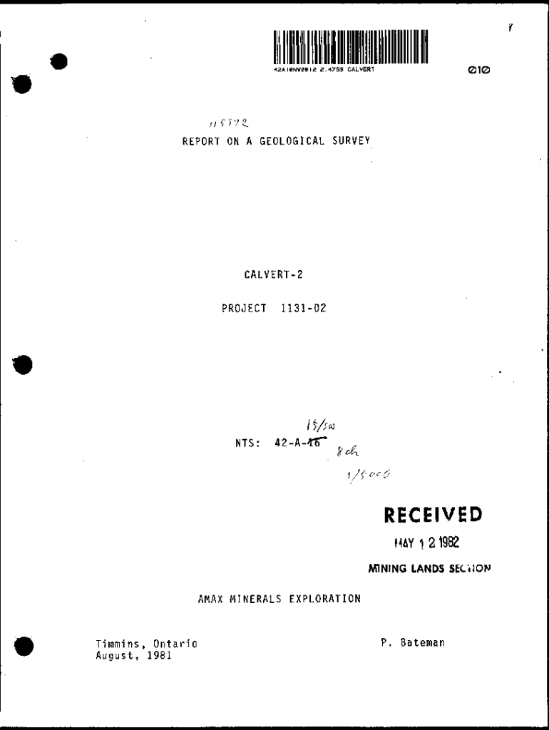 42A10NW9012 8 .4759 CALVERT010REPORT ON A GEOLOGICAL SURVEYCALVERT2 PROJECT113102NTS:42A4T\” RECEIVED MAY l 21982 MINING LANDS SEC.OBAMA MINERALS EXPLORATIONTimmins, Ontario August, 1981P. Bateman1SUMMARYA