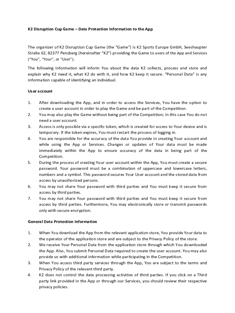 K2 Disruption Cup Game Data Protection Information to the Apple organizer of K2 Disruption Cup Game (the Game) is K2 Sports Europe GmbH, Seeshaupter Straw 62, 82377 Weinberg (hereinafter K2) providing