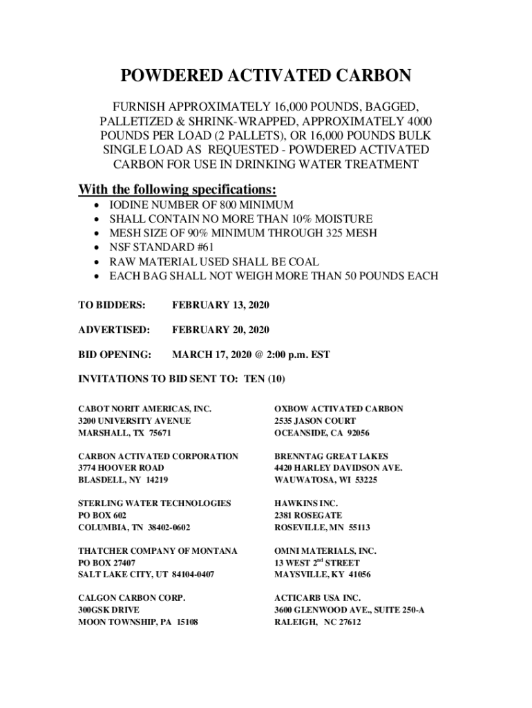 POWDERED ACTIVATED CARBON FURNISH APPROXIMATELY 16,000 POUNDS, BAGGED, PALLETIZED & SHRINKWRAPPED, APPROXIMATELY 4000 POUNDS PER LOAD (2 PALLETS), OR 16,000 POUNDS BULK SINGLE LOAD AS REQUESTED POWDERED