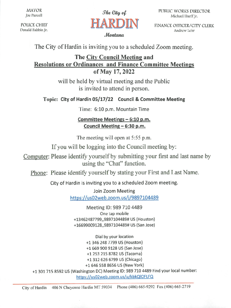 Mayor^PUBLIC WORKS DIRECTOR Joe Furcell^Michael Huff Jr. POLICE CHIEFJTl11II i\'i \'Ni|FINANCE OFFICER/CITY CLERK Donald Bobbin Jr. Andrew LehrMentanaThe City of Hardin is inviting you to a scheduled
