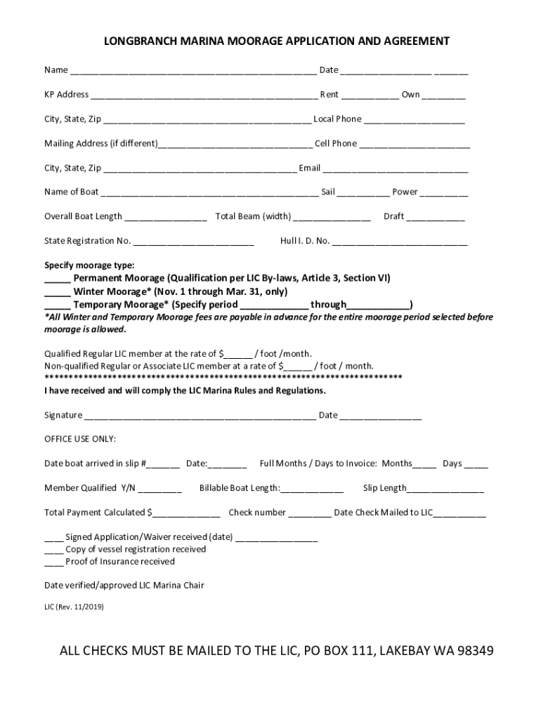 LONGBRANCH MARINA MOOR AGE APPLICATION AND AGREEMENT Name ___ Date ___ ___ KP Address ___ Rent ___ Own ___ City, State, Zip ___ Local Phone ___ Mailing Address (if different)___ Cell Phone ___ City,
