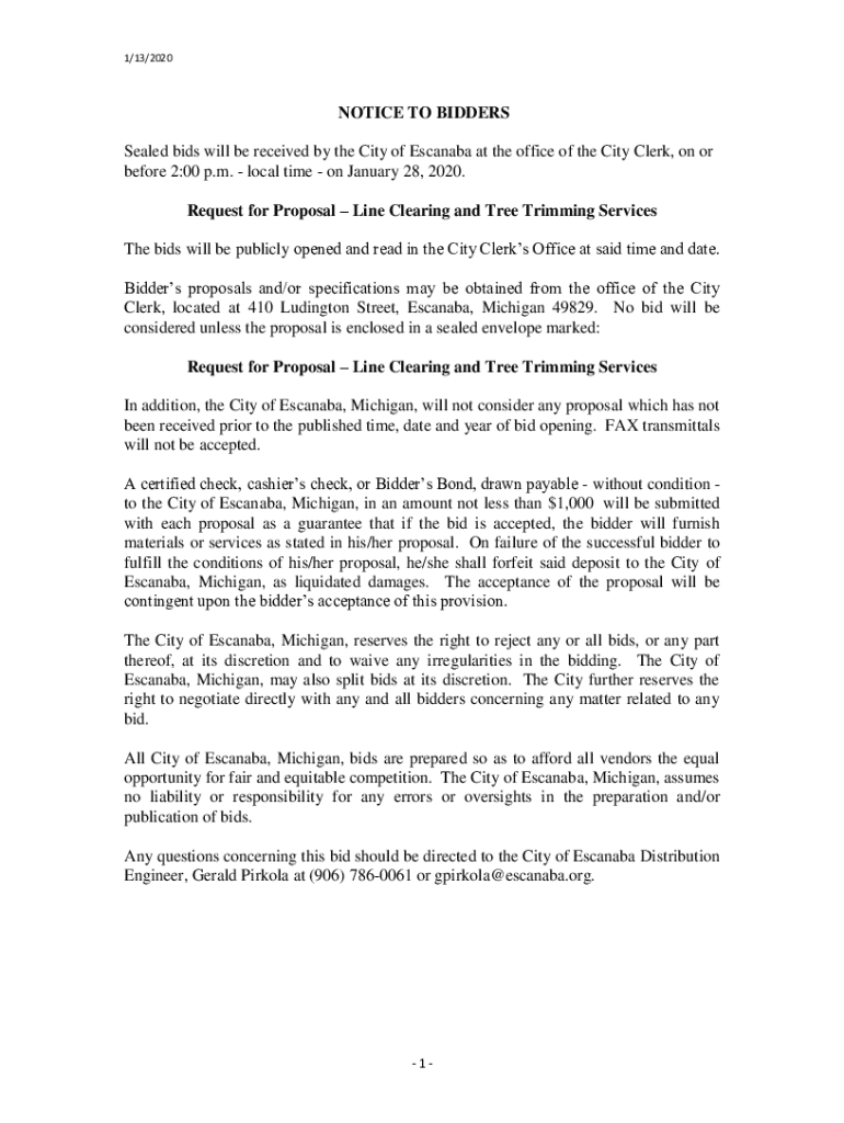 1/13/2020NOTICE TO BIDDERS Sealed bids will be received by the City of Canada at the office of the City Clerk, on or before 2:00 p.m. Local time on January 28, 2020. Request for Proposal Line Clearing