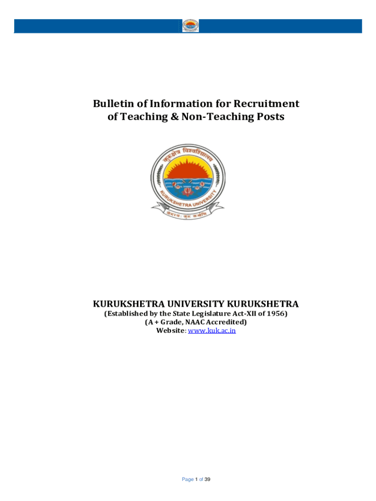 Bulletin of Information for Recruitment of Teaching & Teaching PostsKURUKSHETRA UNIVERSITY KURUKSHETRA (Established by the State Legislature Clxii of 1956) (A + Grade, NAACP Accredited) Website: www.kuk.ac.inPage
