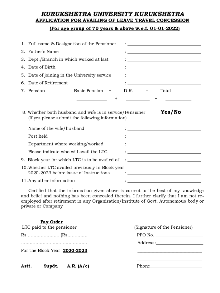 KURUKSHETRA UNIVERSITY KURUKSHETRA APPLICATION FOR AVAILING OF LEAVE TRAVEL CONCESSION (For age group of 70 years & above w.e.f. 01012022) 1. Full name & Designation of the Pensioner: ___2. Fathers