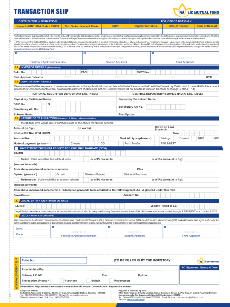 TRANSACTION SLIP DISTRIBUTOR INFORMATION Name & ARN* / RIA Code / MINOR OFFICE USE ONLY Register Serial No. Ruins Broker Name & Code Date of Recapture of Receipt×Upfront commission shall be paid