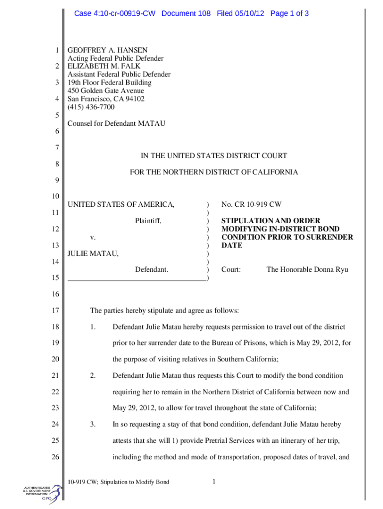 Case 4:10cr00919CW Document 108 Filed 05/10/12-Page 1 of 31 2 3 4GEOFFREY A. HANSEN Acting Federal Public Defender ELIZABETH M. FALL Assistant Federal Public Defender 19th Floor Federal Building 450