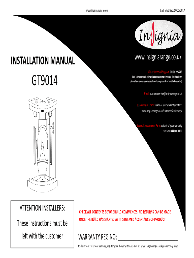 WWW.insignia range. Installation MANUALGT9014Last Modified:27/01/2017www.insignia range.co.UK 30 Day Technical Support: 01908 226545 (NOTE: This service is only available to customers from the day