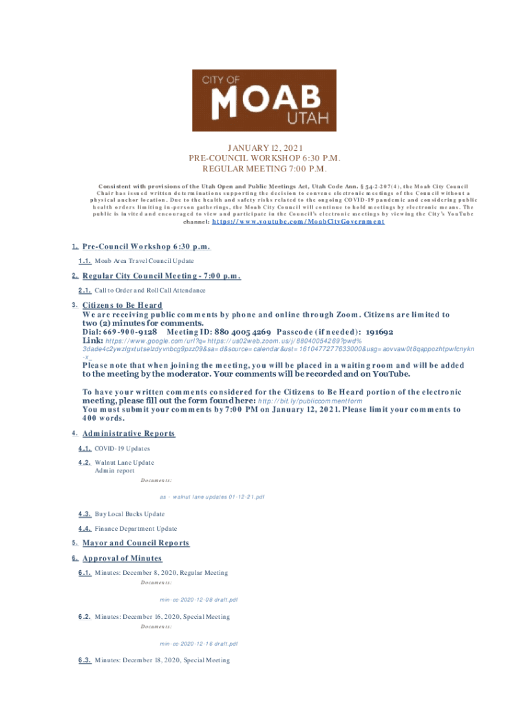 JANUARY 12, 2021, COUNCIL WORKSHOP 6:30 P.M. REGULAR MEETING 7:00 P.M. Consistent with provisions of the Utah Open and Public Meetings Act, Utah Code Ann. 54 2 207(4), the Moab City Council Chair