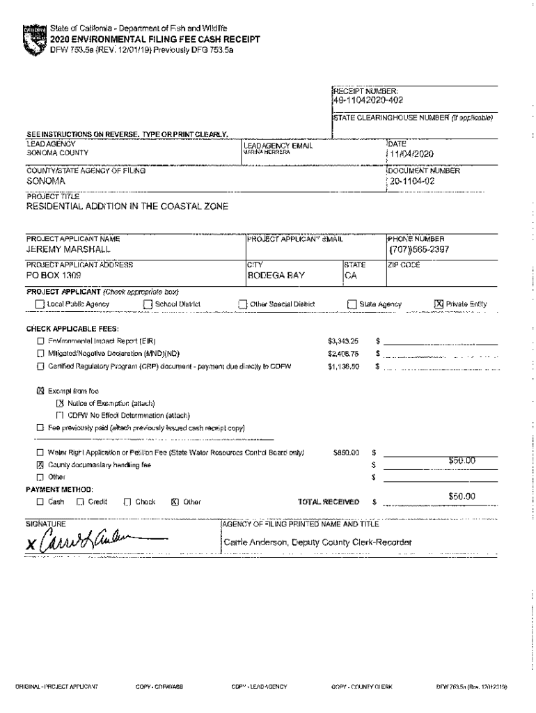 State of California Department of Fish and Wildlife 2020 ENVIRONMENTAL FILING FEE CASH RECEIPT DFW 753.5a (REV. 12/01/19) Previously DFG 753.5aRECEIPT NUMBER:4911042020402 STATE CLEARINGHOUSE NUMBER