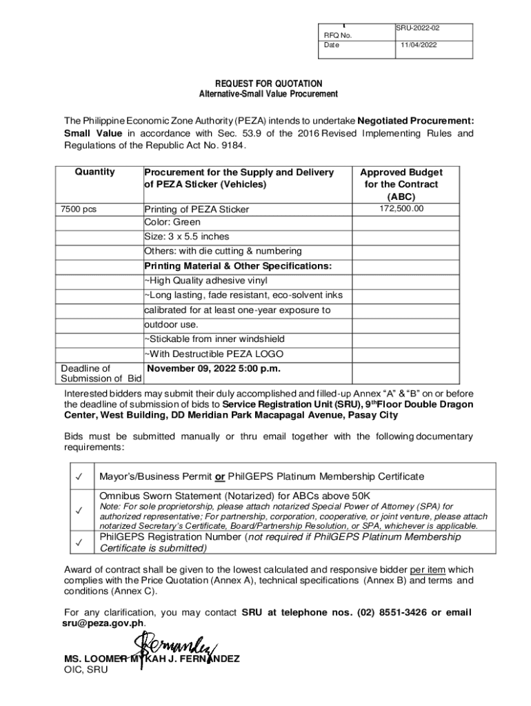 SRU202202 RFQ No. Date11/04/2022REQUEST FOR QUOTATION Alternative Small Value Procurement The Philippine Economic Zone Authority (PEA) intends to undertake Negotiated Procurement: Small Value in accordance