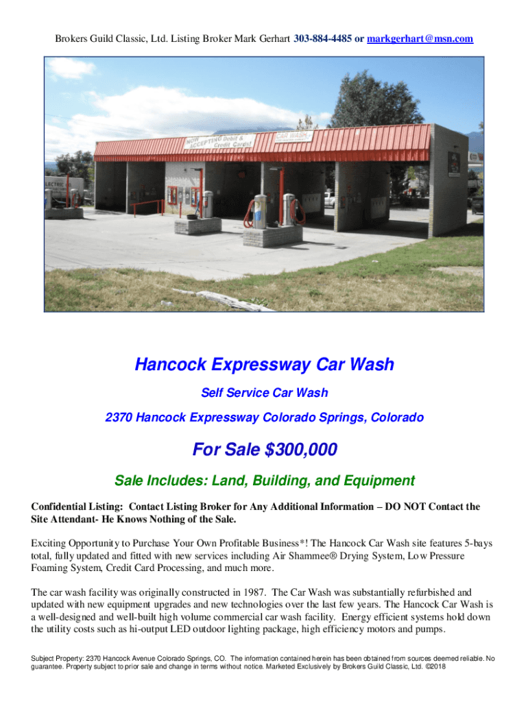 Brokers Guild Classic, Ltd. Listing Broker Mark Ger hart 3038844485 or markgerhart@msn.comHancock Expressway Car Wash Self Service Car Wash 2370 Hancock Expressway Colorado Springs, Colorado Sale