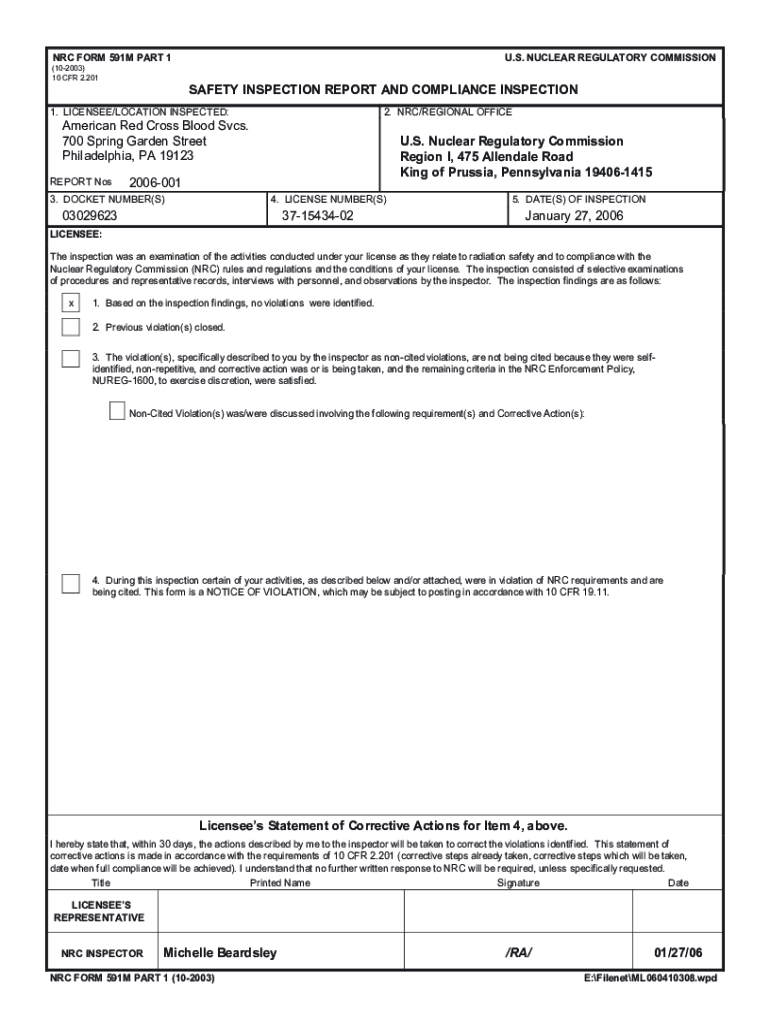 NRC FORM 591M PART 1U. S. NUCLEAR REGULATORY COMMISSION(102003) 10 CFR 2.201SAFETY INSPECTION REPORT AND COMPLIANCE INSPECTION 1. LICENSEE/LOCATION INSPECTED:2. NRC/REGIONAL OFFICE American Red Cross