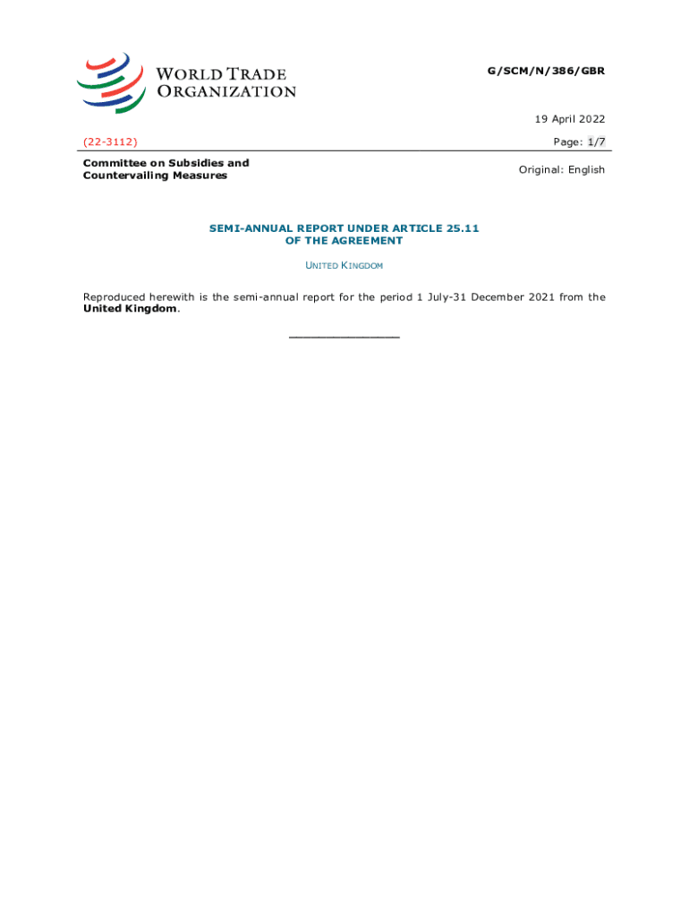 G/SCM/N/386/GBR19 April 2022 (223112)Page: 1/7Committee on Subsidies and Countervailing MeasuresOriginal: EnglishSEMIANNUAL REPORT UNDER ARTICLE 25.11 OF THE AGREEMENT UNITED KINGDOM Reproduced herewith