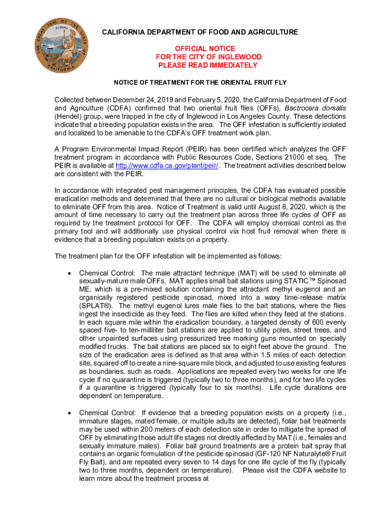 CALIFORNIA DEPARTMENT OF FOOD AND AGRICULTURE OFFICIAL NOTICE FOR THE CITY OF INGLEWOOD PLEASE READ IMMEDIATELY NOTICE OF TREATMENT FOR THE ORIENTAL FRUIT Collected between December 24, 2019, and