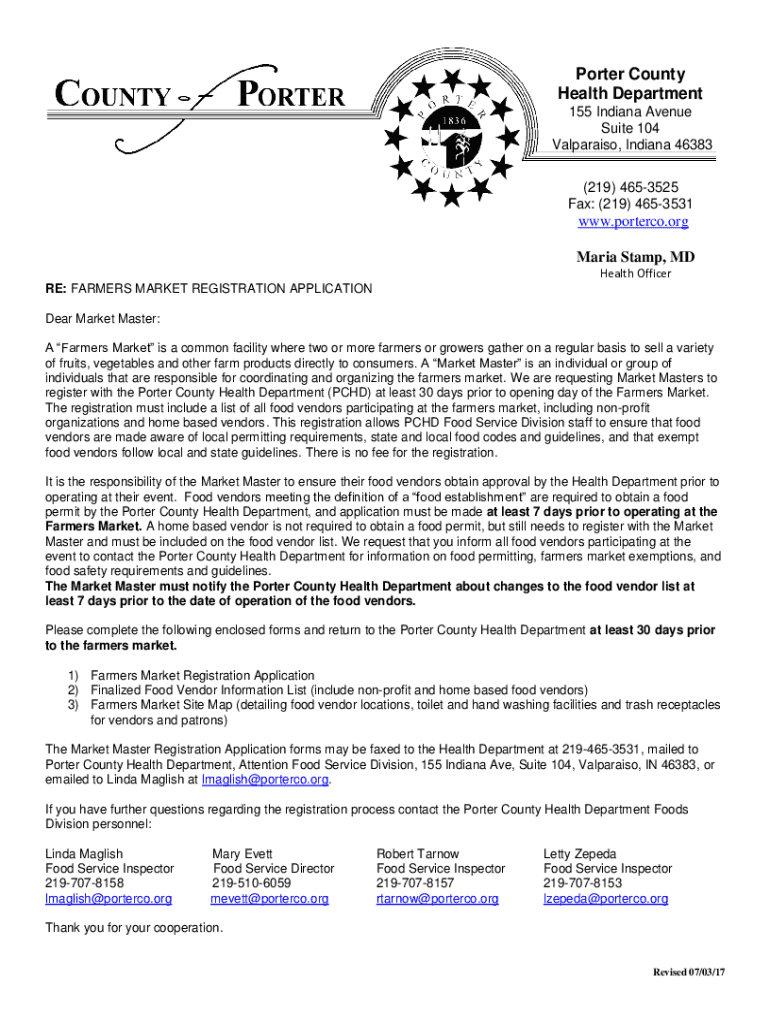 Porter County Health Department 155 Indiana Avenue Suite 104 Valparaiso, Indiana 46383 (219) 4653525 Fax: (219) 4653531www. Porter co.org Maria Stamp, MD Health Officer RE: FARMERS MARKET REGISTRATION