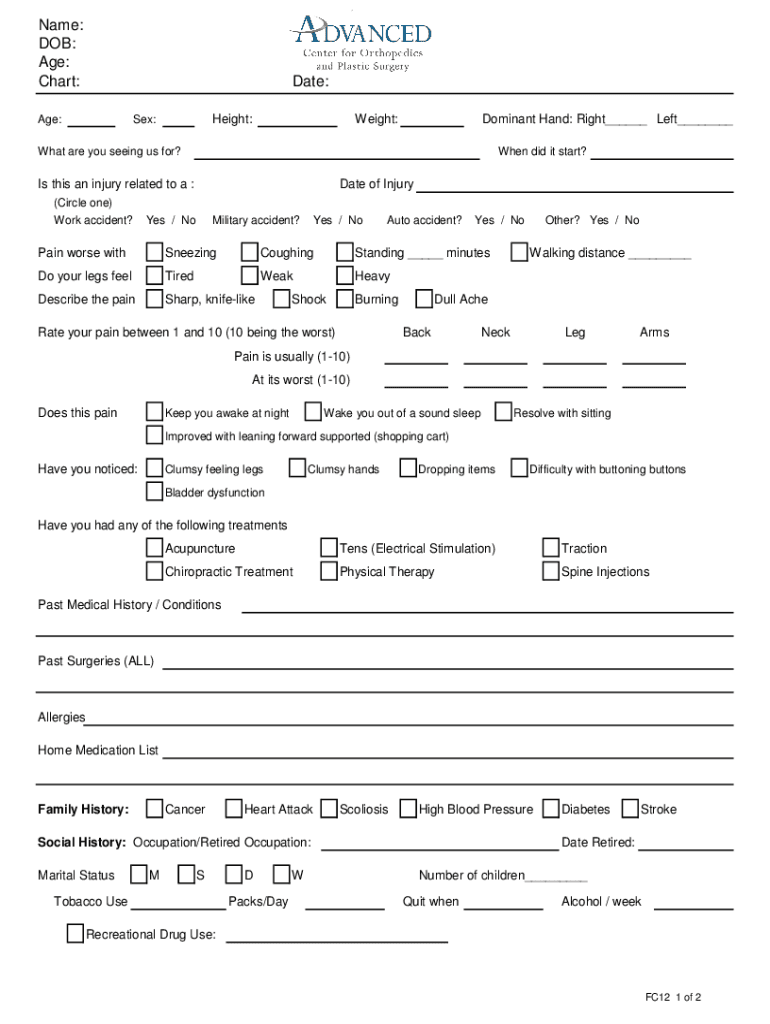 Name: DOB: Age: Chart:Date:Age:Height:Sex:Weight:Dominant Hand: Right___ Left___What are you seeing us for? When did it start? Is this an injury related to a :Date of Injury(Circle one) Work accident?