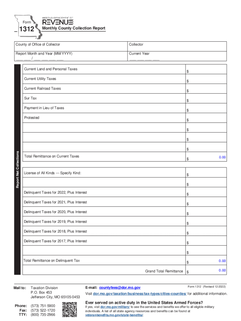 Get the free Form 1312 - Monthly County Collection Report - MO.gov - dor mo