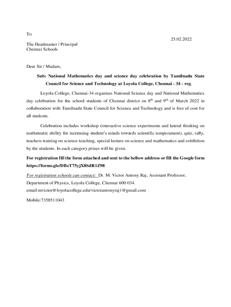 To 25.02.2022 The Headmaster / Principal Chennai Schoolmate Sir / Madam, Sub: National Mathematics day and science day celebration by Tamil Nadu State Council for Science and Technology at Loyola
