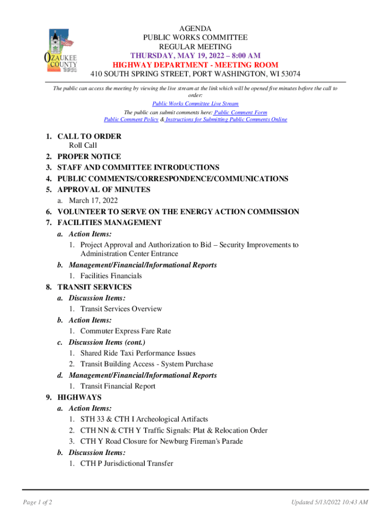 AGENDA PUBLIC WORKS COMMITTEE REGULAR MEETING THURSDAY, MAY 19, 2022 8:00 AM HIGHWAY DEPARTMENT MEETING ROOM 410 SOUTH SPRING STREET, PORT WASHINGTON, WI 53074 The public can access the meeting by