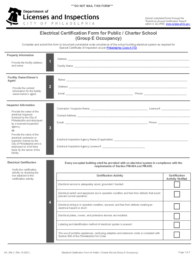 ***DO NOT MAIL THIS FORM***Upload completed forms through to Submit an Annual Certification Report option in eclipse. www.eclipse.phila.gov. Electrical Certification Form for Public / Charter School
