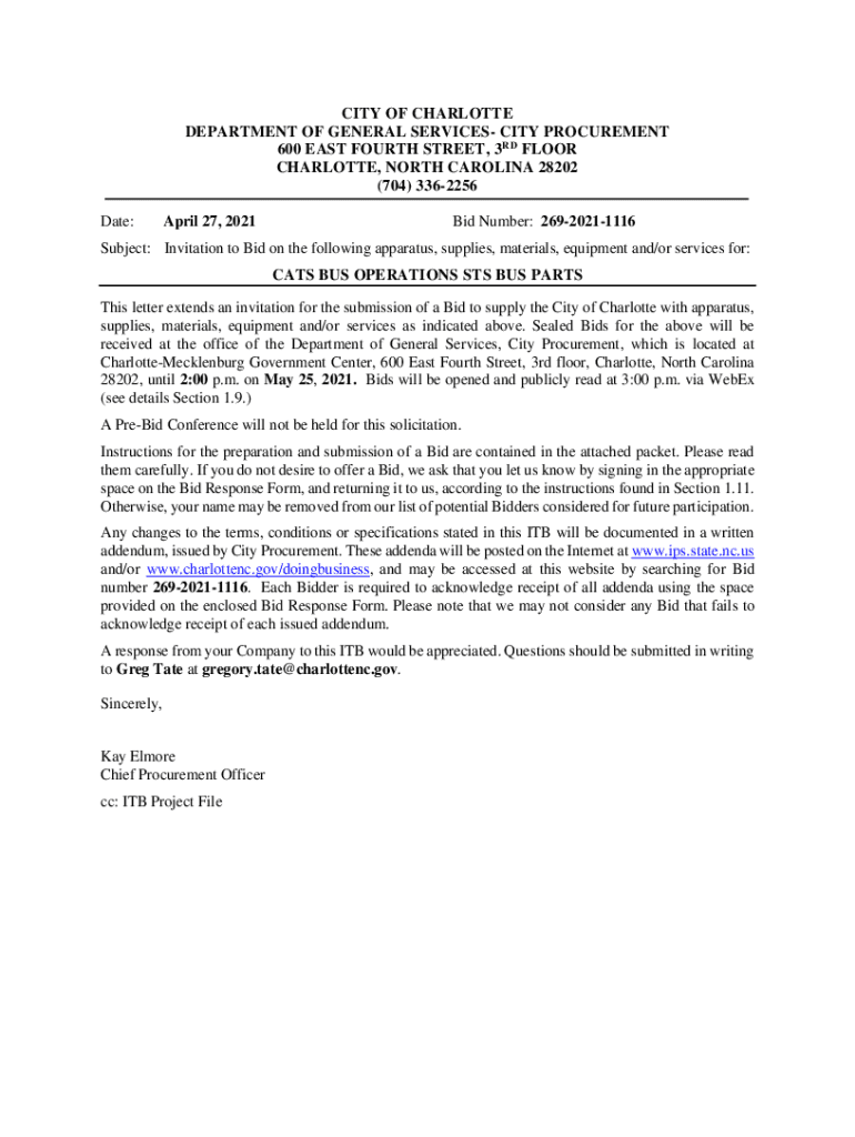 CITY OF CHARLOTTE DEPARTMENT OF GENERAL SERVICES CITY PROCUREMENT 600 EAST FOURTH STREET, 3RD FLOOR CHARLOTTE, NORTH CAROLINA 28202 (704) 3362256 Date:April 27, 2021Bid Number: 26920211116Subject:
