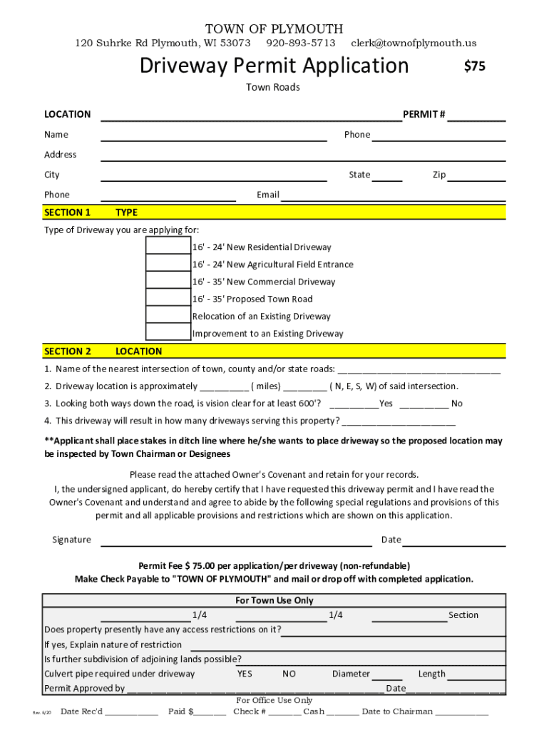 TOWN OF PLYMOUTH 120 Sure Rd Plymouth, WI 530739208935713clerk@townofplymouth.usDriveway Permit Application$75Town Roads LOCATIONPERMIT #NamePhoneAddress CityStatePhoneZipEmailSECTION 1TYPEType of