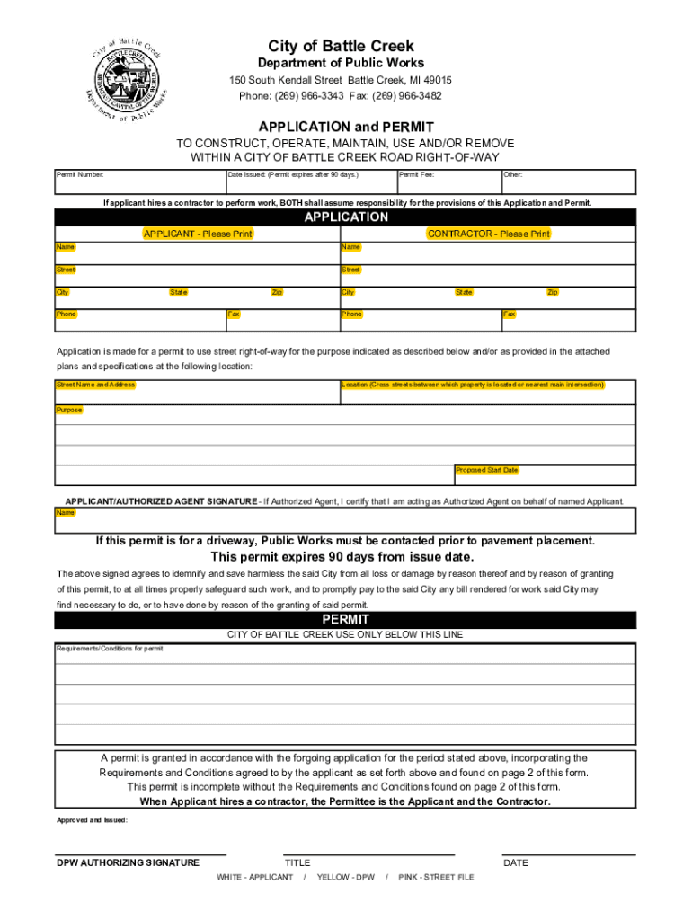 City of Battle Creek Department of Public Works 150 South Kendall Street Battle Creek, MI 49015 Phone: (269) 9663343 Fax: (269) 9663482APPLICATION and PERMIT Constructing, OPERATE, MAINTAIN, USE AND/OR