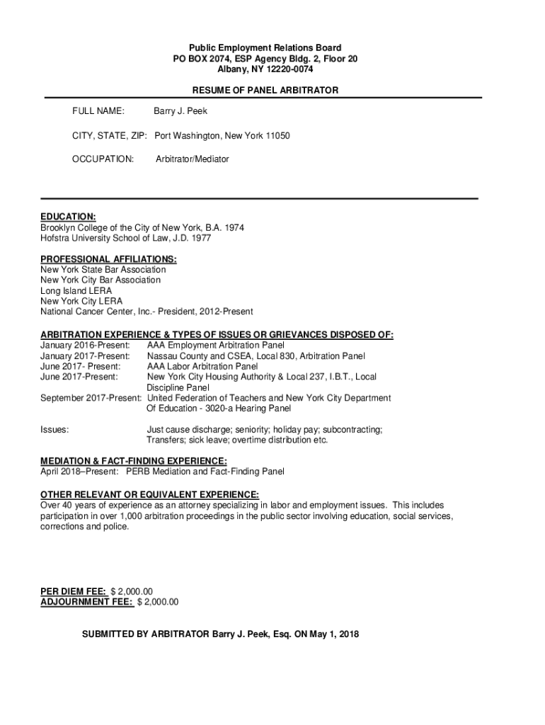 Public Employment Relations Board PO BOX 2074, ESP Agency Bldg. 2, Floor 20 Albany, NY 122200074 RESUME OF PANEL ARBITRATOR FULL NAME:Barry J. Velocity, STATE, ZIP: Port Washington, New York 11050