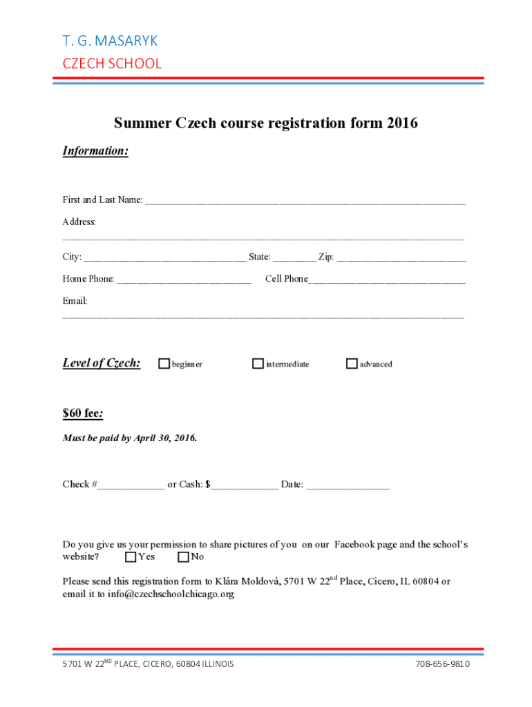 T. G. MASARYKCZECH SCHOOL Summer Czech course registration form 2016 Information:First and Last Name: ___ Address: ___ City: ___ State: ___ Zip: ___ Home Phone: ___Cell Phone___Email: ___Level of