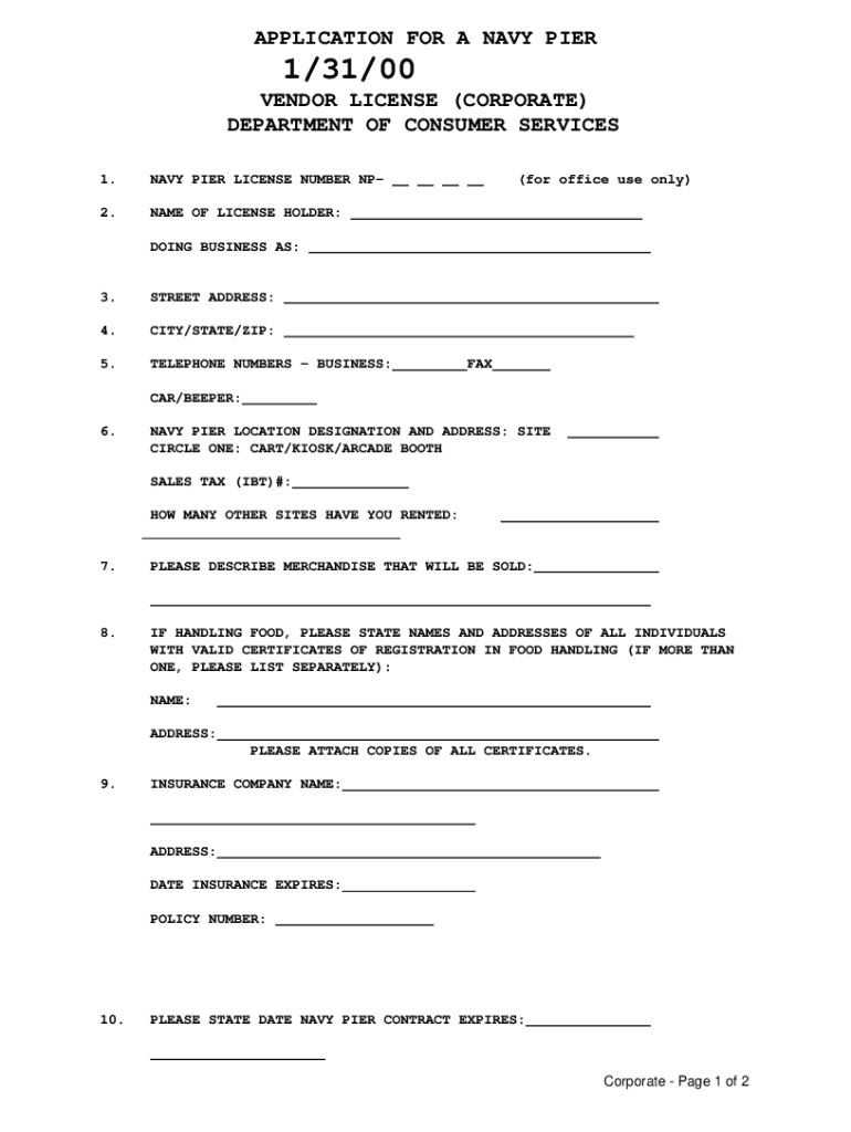 APPLICATION FOR A NAVY PIER1/31/00 VENDOR LICENSE (CORPORATE) DEPARTMENT OF CONSUMER SERVICES 1.NAVY PIER LICENSE NUMBER NP2.NAME OF LICENSE HOLDER:(for office use only)DOING BUSINESS AS:3.STREET