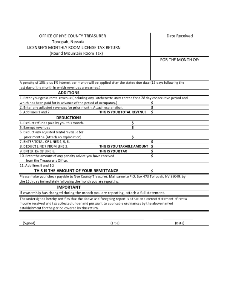OFFICE OF NYE COUNTY TREASURER Tooth, Nevada LICENSEE\'S MONTHLY ROOM LICENSE TAX RETURN (Round Mountain Room Tax)Date Received THE MONTH OF:A penalty of 10% plus 1% interest per month will be applied