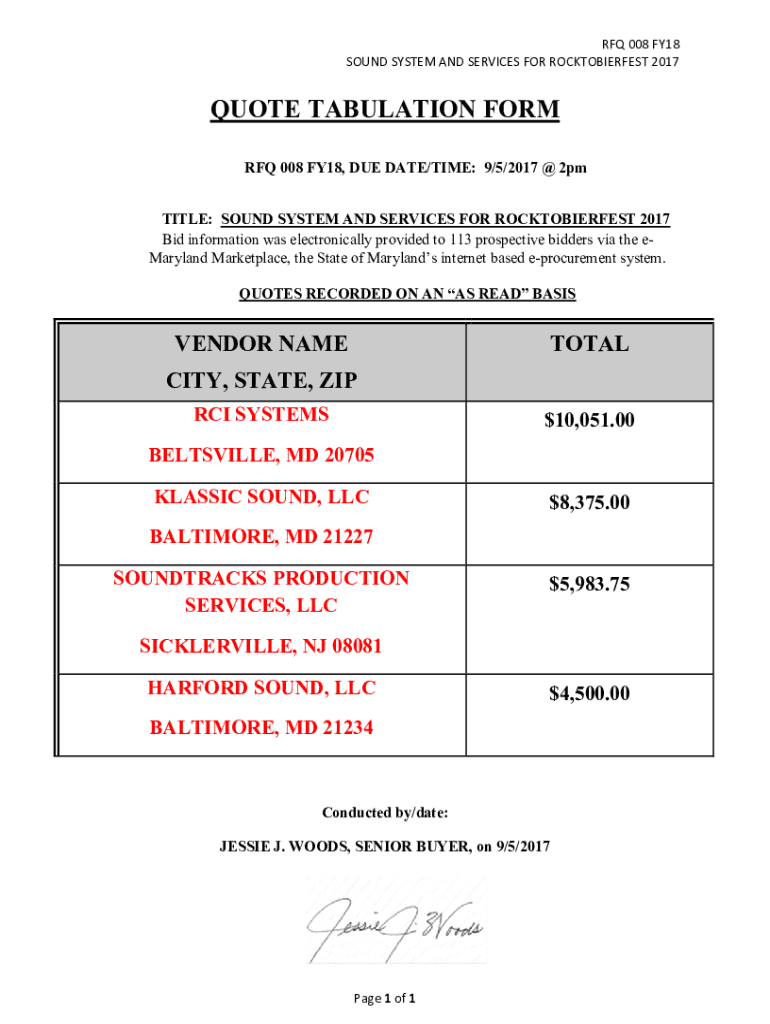 Get the free QUOTE TABULATION FORM RFQ 041/FY18, DUE DATE/TIME: April 17, 20182pm