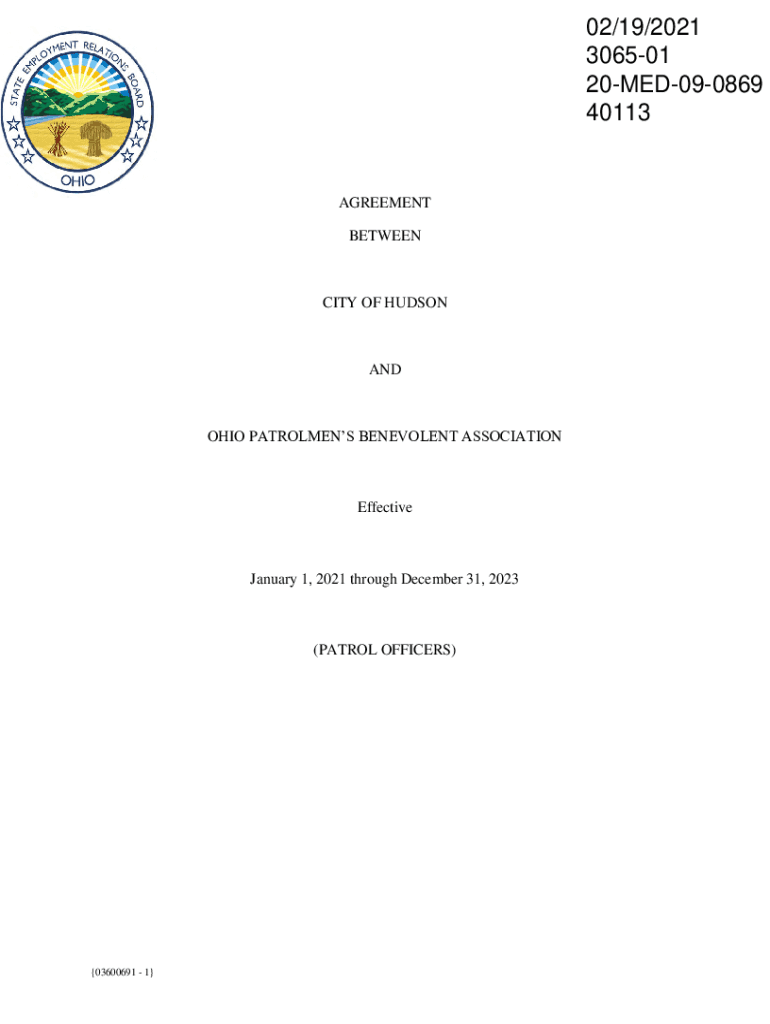 02/19/2021 306501 20MED090869 40113AGREEMENT BETWEENCITY OF HUDSONANDOHIO PATROLMEN BENEVOLENT ASSOCIATIONEffectiveJanuary 1, 2021 through December 31, 2023(PATROL OFFICERS)03600691 1TABLE OF CONTENTS