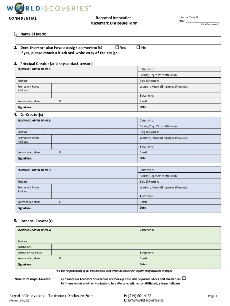 Internal Tech ID: ___ BDM: ___Report of Innovation Trademark Disclosure FormCONFIDENTIAL(for office use only)1. Name of Mark: 2. Does the mark also have a design element to it? Yes If yes, please