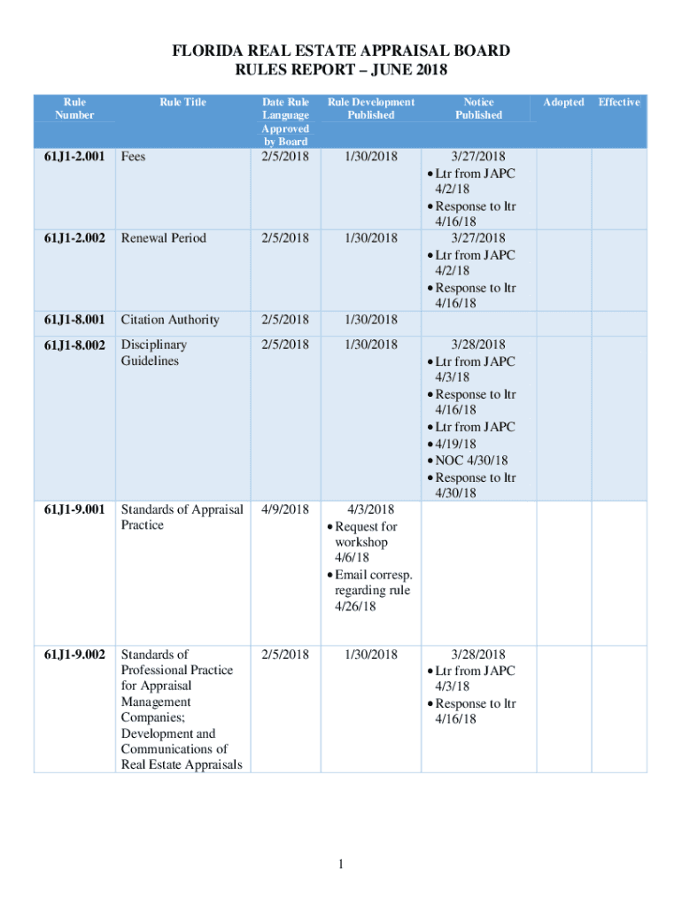 FLORIDA REAL ESTATE APPRAISAL BOARD RULES REPORT JUNE 2018 Rule Numerable Title Date Rule Language Approved by Boardwalk Development Published61J12.001Fees2/5/20181/30/201861J12.002Renewal Period2/5/20181/30/201861J18.001Citation