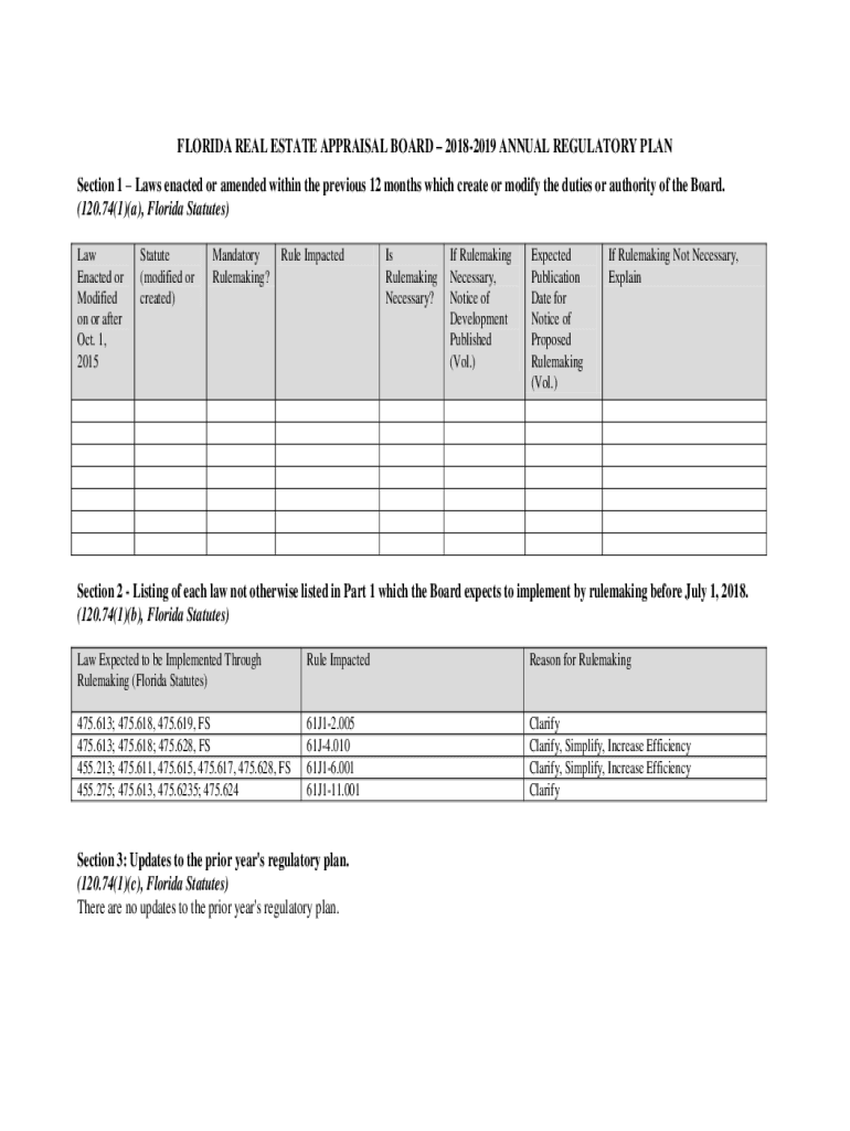 FLORIDA REAL ESTATE APPRAISAL BOARD 20182019 ANNUAL REGULATORY PLAN Section 1 Laws enacted or amended within the previous 12 months which create or modify the duties or authority of the Board. (120.74(1)(a),