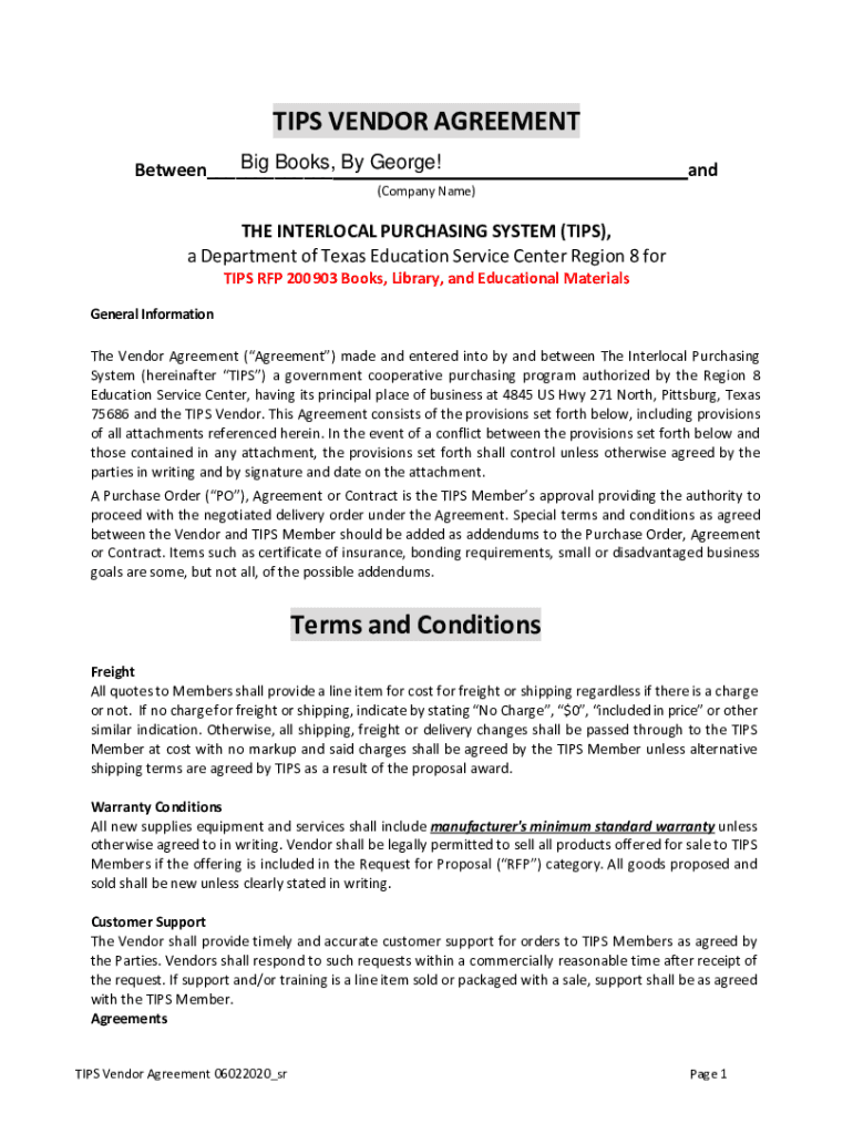 TIPS VENDOR AGREEMENT Big Books, By George! Between___and(Company Name)THE INTERLOCK PURCHASING SYSTEM (TIPS), a Department of Texas Education Service Center Region 8 for TIPS RFP 200903 Books, Library,