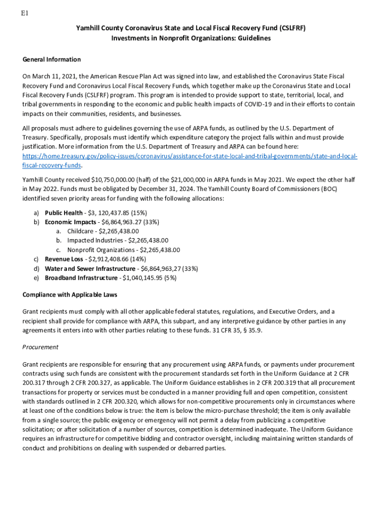 E1Yamhill County Coronavirus State and Local Fiscal Recovery Fund (CSL FRF) Investments in Nonprofit Organizations: Guidelines General Information On March 11, 2021, the American Rescue Plan Act was