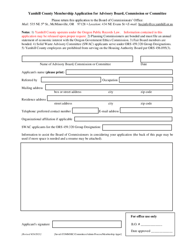 Yam hill County Membership Application for Advisory Board, Commission or Committee Please return this application to the Board of Commissioners Office: Mail: 535 NE 5th St., McMinnville, OR 97128