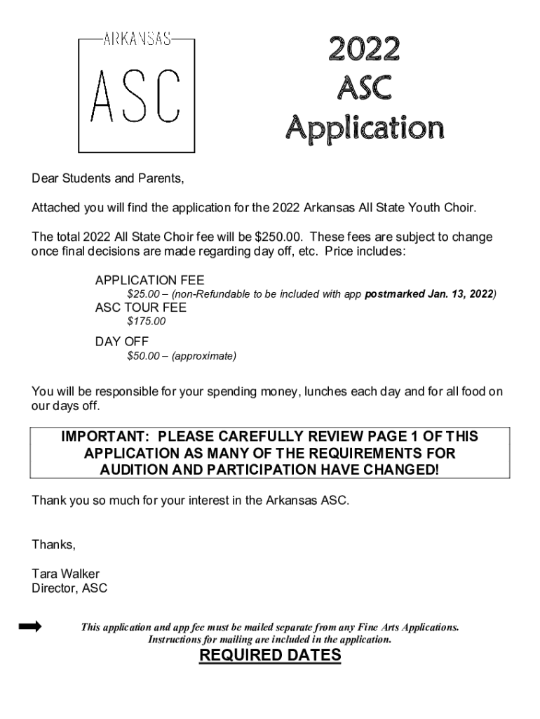 2022 ASC Application Dear Students and Parents, Attached you will find the application for the 2022 Arkansas All State Youth Choir. The total 2022 All State Choir fee will be $250.00. These fees are