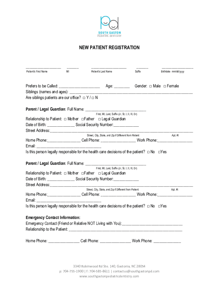 NEW PATIENT REGISTRATION _________Patient\'s First NameMIPatient\'s Last Name___ Suffix___ Birthdate mm/dd/yyyyPrefers to be Called: ___ Age: ___ Gender: Male Female Siblings (names and ages): ___