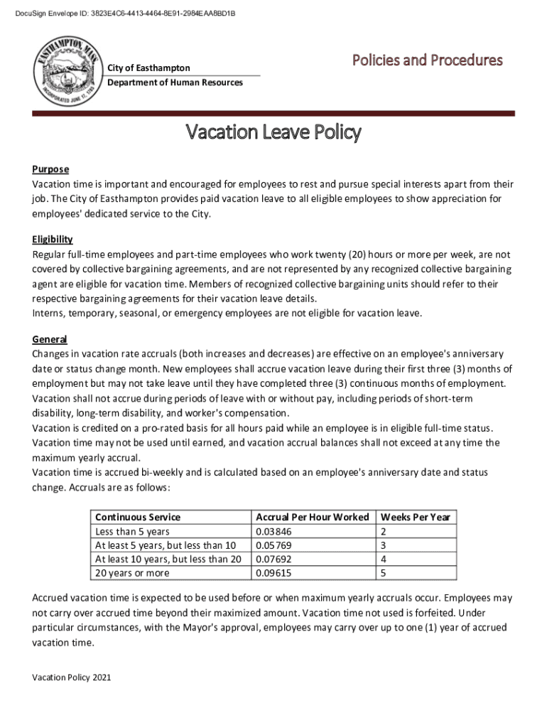 DocuSign Envelope ID: 3823E4C6441344648E912984EAA8BD1BCity of Southampton Department of Human ResourcesPolicies and ProceduresVacation Leave Policy Purpose Vacation time is important and encouraged