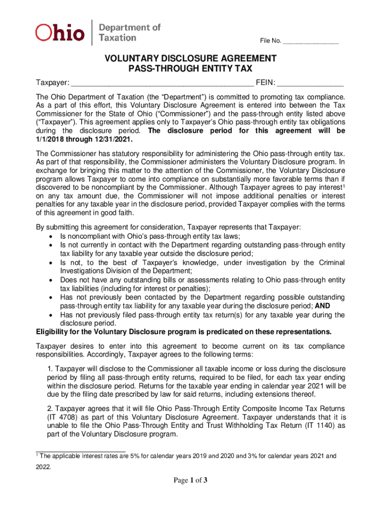 File No. ___VOLUNTARY DISCLOSURE AGREEMENT WALKTHROUGH ENTITY TAX Taxpayer: ___ VEIN: ___ The Ohio Department of Taxation (the Department) is committed to promoting tax compliance. As a part of this