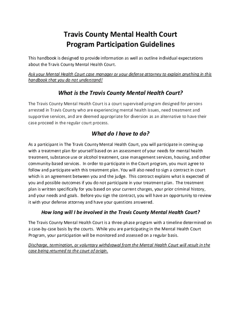 Travis County Mental Health Court Program Participation Guidelines This handbook is designed to provide information as well as outline individual expectations about the Travis County Mental Health