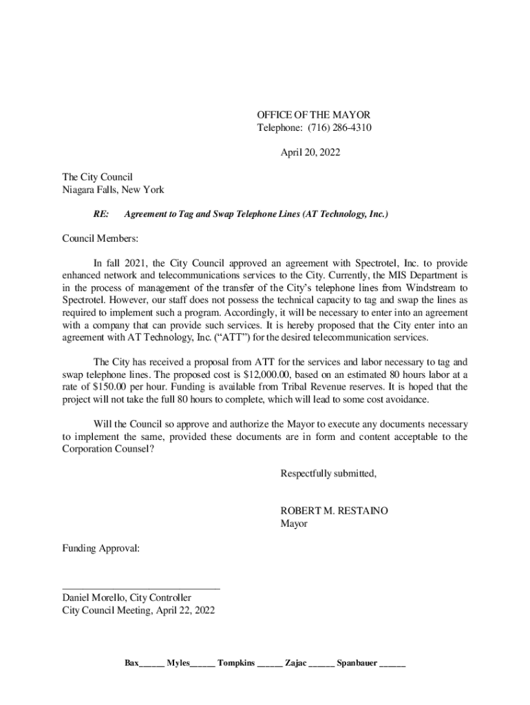 OFFICE OF THE MAYOR Telephone: (716) 2864310 April 20, 2022, The City Council Niagara Falls, New York RE:Agreement to Tag and Swap Telephone Lines (AT Technology, Inc.) Council Members: In fall 2021,