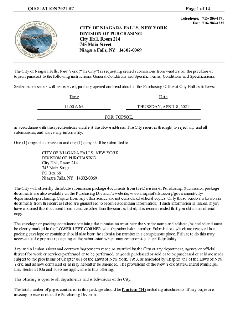 QUOTATION 202107Page 1 of 14 Telephone: 7162864371 Fax: 7162864337CITY OF NIAGARA FALLS, NEW YORK DIVISION OF PURCHASING City Hall, Room 214 745 Main Street Niagara Falls, NY 143020069The City of