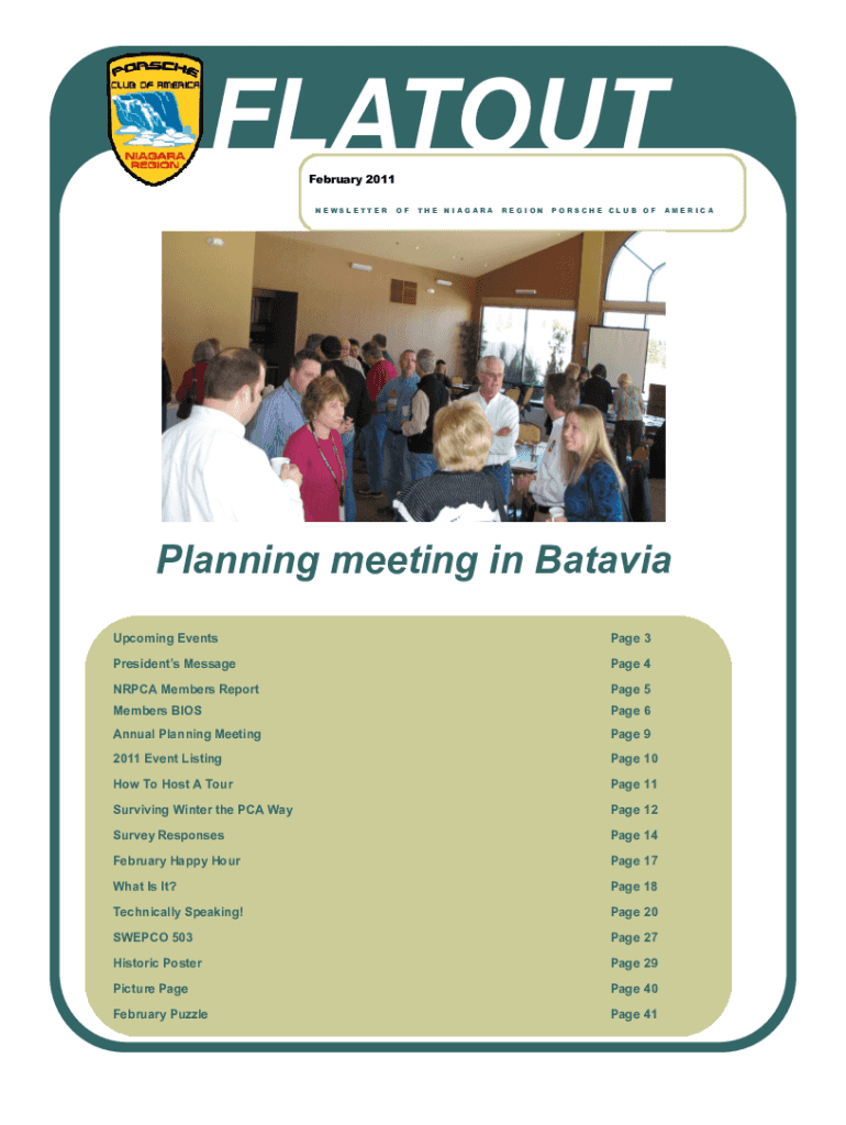 LAYOUT February 2011 NEWSLETTEROFTHENIAGARAREGIONPORSCHECLUB OFAMERICAPlanning meeting in Batavia Upcoming Events Page 3Presidents Message Page 4NRPCA Members Reportage 5Members BIOS Page 6Annual