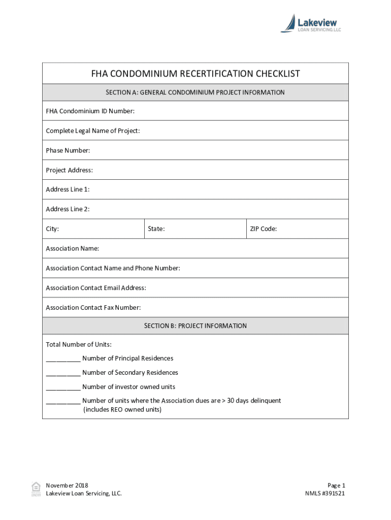 Clear Form FHA CONDOMINIUM RECERTIFICATION CHECKLIST SECTION A: GENERAL CONDOMINIUM PROJECT INFORMATION FHA Condominium ID Number: Complete Legal Name of Project: Phase Number: Project Address: Address